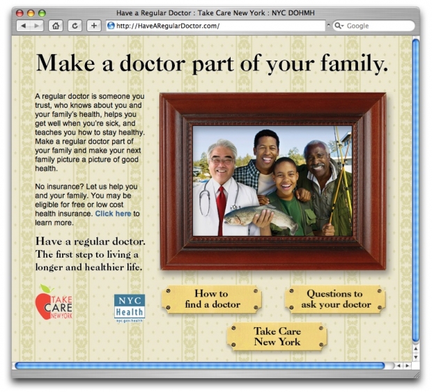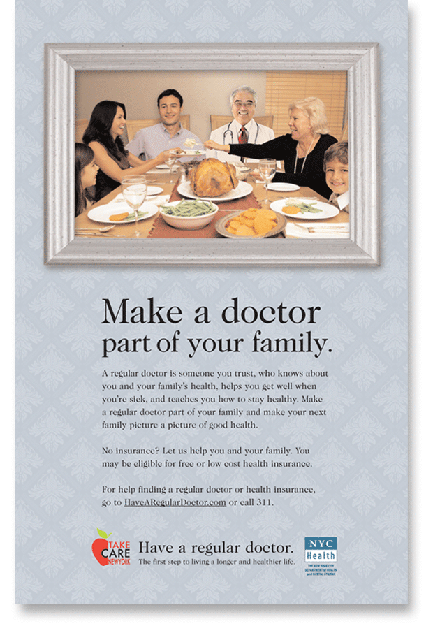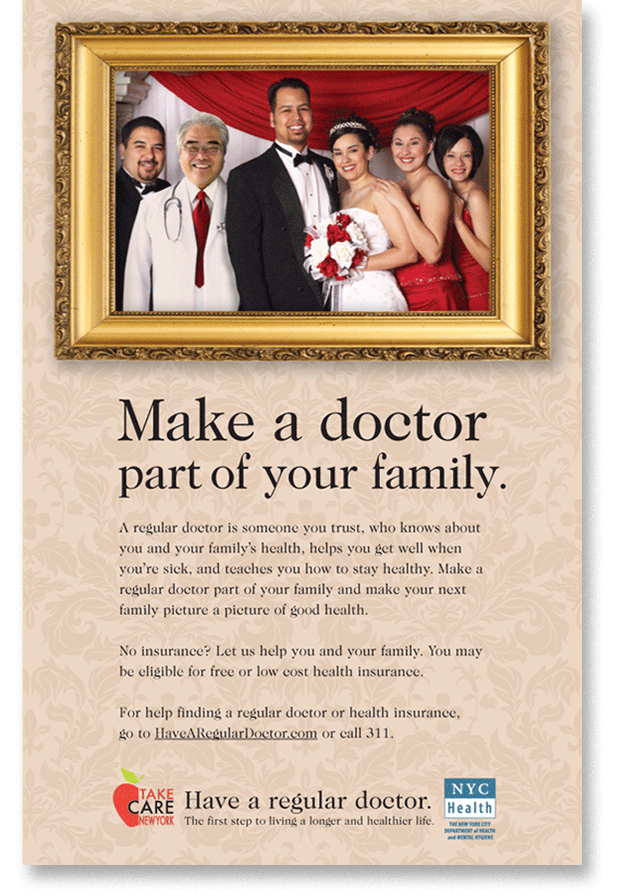 The vast majority of NYC residents do not get regular medical checkups and as a result, health issues that could have been mitigated during regular screenings can often become catastrophic. As part of NYC's Take Care initiative, we developed a tongue-in-cheek campaign that encouraged families to establish a closer relationship with their doctors.