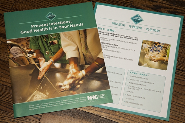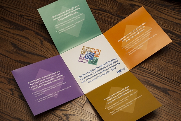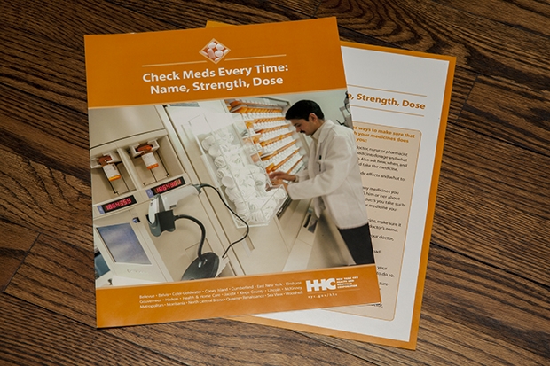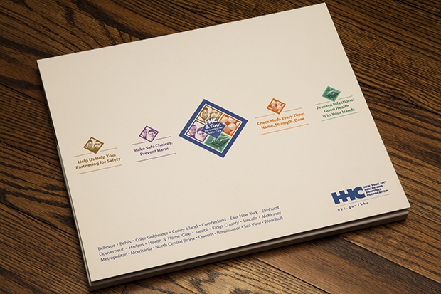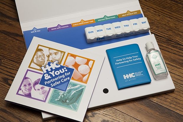 The items included: advertising panels, posters, banners (installed at every HHC hospital), a binder with die-cut tabbed dividers, an origami-folded brochure, 3 one-fold brochures, two-sided sheets (translated into 12 languages), bookmarks, pins, pens, hand sanitizer, patient meds card and notepad.
